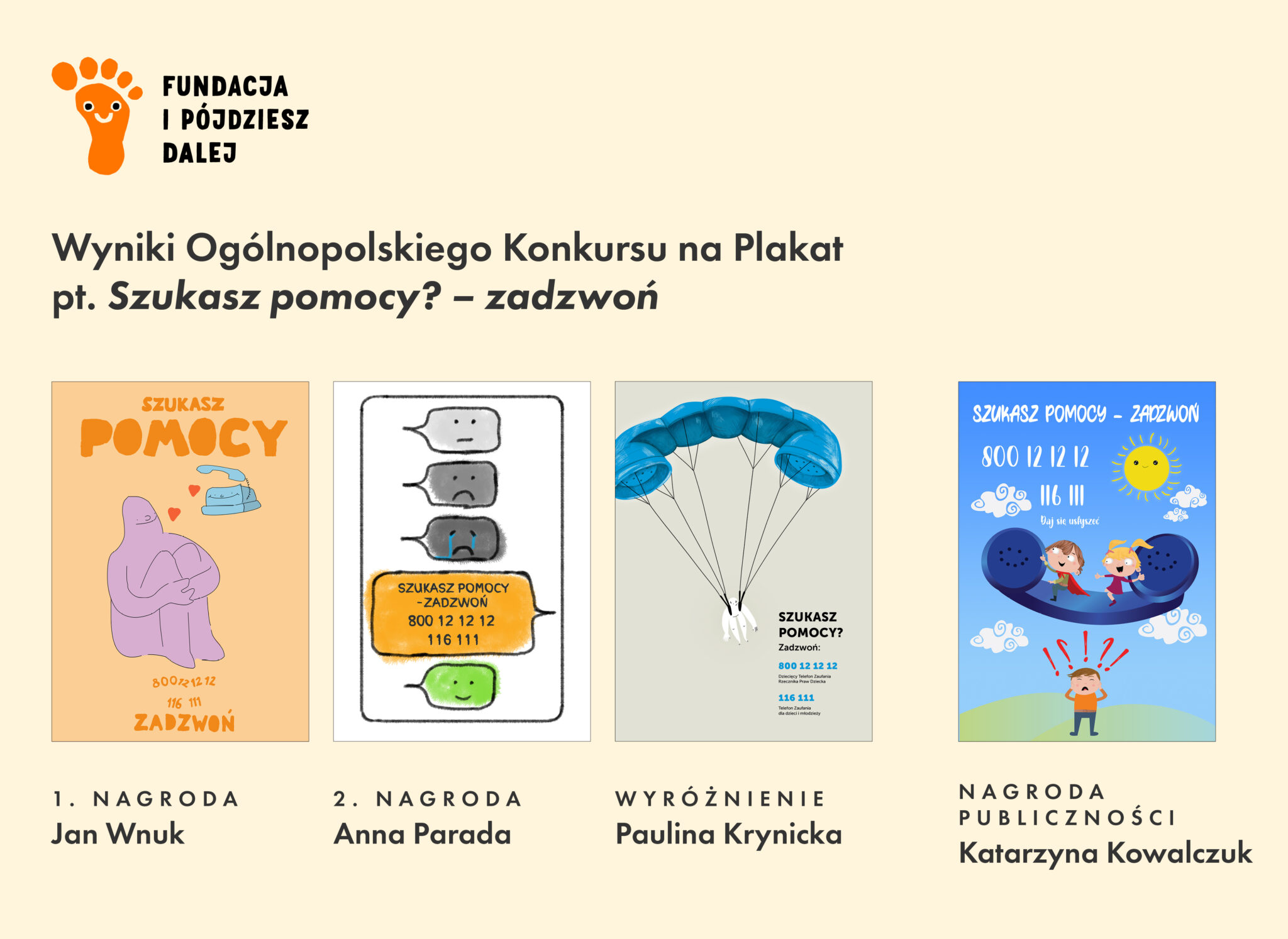 Mamy wielką przyjemność ogłosić wyniki Ogólnopolskiego Konkursu na plakat pt. „Szukasz pomocy? – zadzwoń” organizowanego przez Fundację I Pójdziesz Dalej. Liczba zgłoszonych prac przerosła nasze oczekiwania. Z zakwalifikowanych prac, spełniających wymogi regulaminu, jury wyselekcjonowało trzy prace: