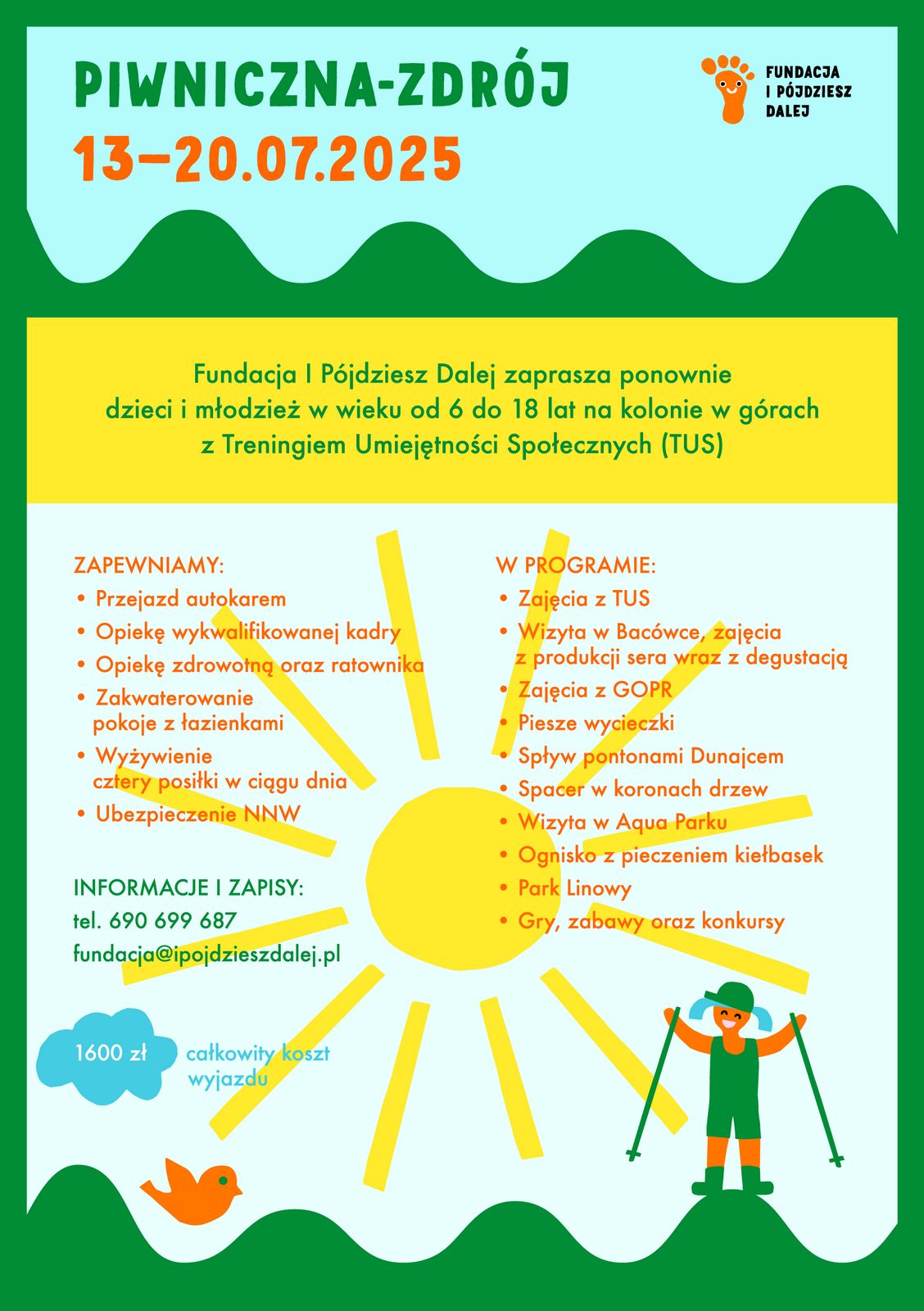 Fundacja I Pójdziesz Dalej zaprasza ponownie dzieci i młodzież w wieku od 6 do 18 lat na kolonie w górach Z TRENINGIEM UMIEJĘTNOŚCI SPOŁECZNYCH (TUS) w terminie: 13.07.2025r-20.07.2025r